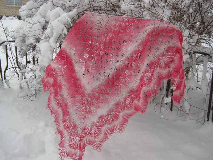 Шаль треугольной формы связана спицами из тонкой шерстяной пряжи Кауни. Модель "Харуни" Шаль -- очень удобная одежда для женщины, она согреет в холодную пору года, заменит тёплый жакет, красиво драпируется поверх любой одежды. Незаменимый подарок для женщины любого возраста.