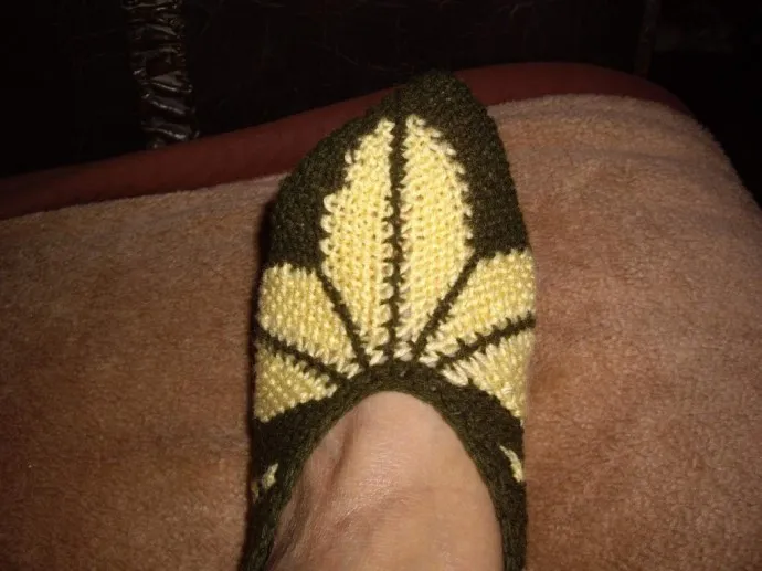 Когда на спицах желтых петель получится 14 петель, нужно провязать зелеными от начало ряда до конца туда и обратно. Это получился один лепесток.