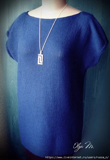 Вязание начинаем от рукава, затем, прибавляя петли получаем боковые стороны спинки и переда. Дойдя до начала горловины, вязание разделить на спинку и перед (эти части далее вяжутся раздельно на нужную длину выреза горловины), затем их снова соединяем, провязываем необходимое количество рядов, закрываем петли спинки и переда, оставляем петли для второго рукава, провязываем еще нужную длину и все петли закрываем.