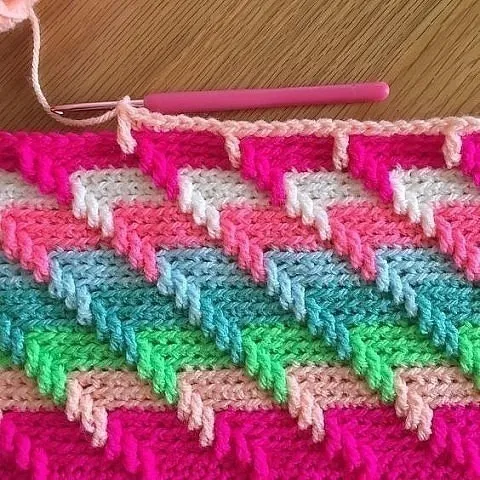 Вязание основного полотна за заднюю дужку петли + через заданный промежуток, 1 столбик провязываем на несколько рядов ниже + чередование цветов.