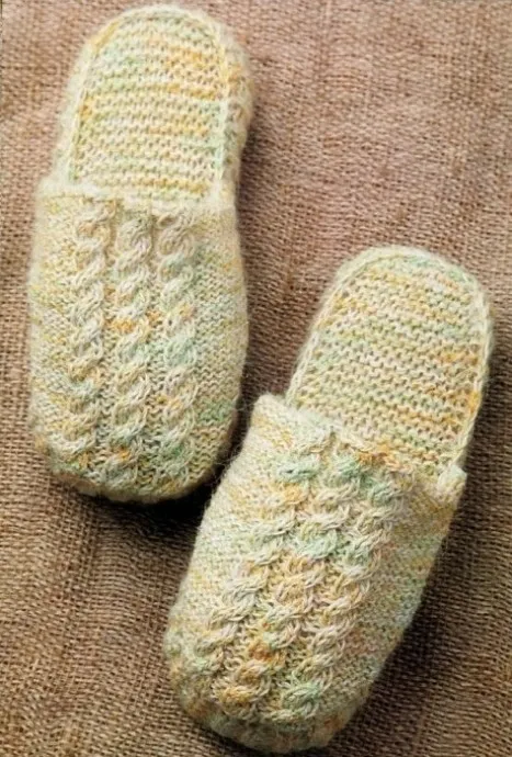 Для следка наберите на спицы 14 п. и вяжите платочной гладью 34 ряда. Потом прибавьте с одной стороны в каждом втором ряду 3 раза х 1 п. Следующие 24 ряда провяжите ровно. Затем провяжите 6 рядов, убавляя в начале и в конце каждого ряда по 1 п. Оставшиеся петли закройте. Второй следок свяжите аналогично, только прибавления делайте с другой стороны.