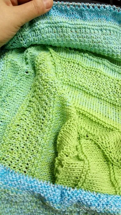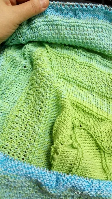 Вязала с центральной линией, прибавки в конце ряда, начале, перед и после центральной линии. Узоры использовала такие - лицевая гладь, платочная вязка, "дырочки" (накид, две вместе лицевой), двойной рис. Комбинировала как виделось, по ходу работы.