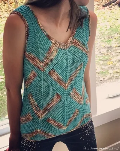 Плотность вязания для каждых 10 см составляет 17 петель платочной вязки на спицах № 4,5. Подберите и отрегулируйте номер спиц, чтобы вязаный топ имел хорошую посадку как на фото.