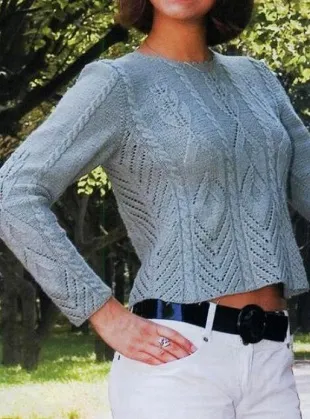 Модный пуловер серого цвета укороченного силуэта связан спицами. В этом пуловере хорошо сочетаются несколько разных узоров. Это и ажурная перевернутая "елочка", и ромбы, заканчивающиеся веточкой с листьями. Кроме того узоры разделяются друг с другом узором "коса". Пуловер хорошо сочетается с брюками спортивного силуэта и джинсами. Такой пуловер подойдет девушкам со стройной фигурой или "фитоняшкам", счастливым обладательницами спортивной фигуры. Далее - схемы вязания пуловера спицами.