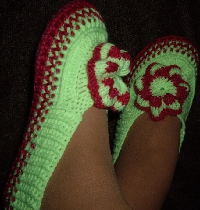 7 ряд - столбики с 2-мя накидами (Ст. 2н); пропуская 1 петлю; не довязывая последнею петлю соединяем все петли в одну и затягиваем; Далее продолжаем вязать по кругу еще три ряда, но на мыске вяжем столбиками без накида, а на пяточке рельефными столбиками. Украшаем цветочком.