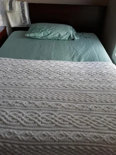Это был вязальный запой, когда у меня была идея фикс, связать комплект на кровать в технике аранских узоров. Вязала я его 4 мес с июля по октябрь...Так как в Испании нет отопления в квартирах, он мне очень пригодился и в комплекте на кровати смотрится очень эффектно...