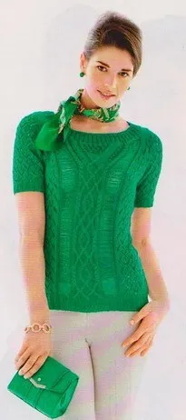 Зеленая летняя маечка связана спицами узором с переплетениями и ажурным узором. Края маечки, рукавов и вырез горловины выполнены резинкой.