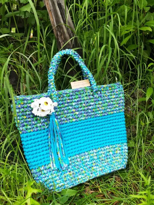 Связала на конкурс сумку "Василёк" из трикотажной пряжи "Бисквит".