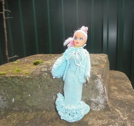 Куклена всего 15 см. Первая работа на такую мелкую. Мой привычный формат в 2 раза больше. так что, этот комплект еще одна моя " проба пера", вернее спиц.))