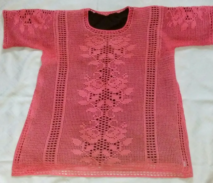 Представляю на ваш суд, дорогие мастерицы, туничку в филейной технике. Связана из слонимской пряжи хлопок, цвет Розовый лепесток, расход 270 г. Размер 54-56
