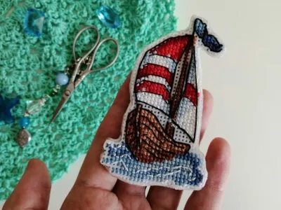 В наборе для вышивки идет 4 магнита: корабль, маяк, компас, якорь. То есть у нас получится целая морская коллекция! Корабль сделала за один день, сегодня приступила к маяку. Раз уж не получается съездить на отдых, надо визуализировать этот вопрос!