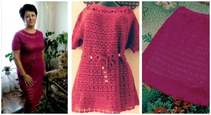 В конце прошлого лета связала себе костюм. Пряжа Пехорка "Цветное кружево", узор "Лилии" .В пояс юбки ввязала спандекс. Ну и стразики в пояс... А, ещё забыла, в кофточке и поясе - колечки "Гамма"