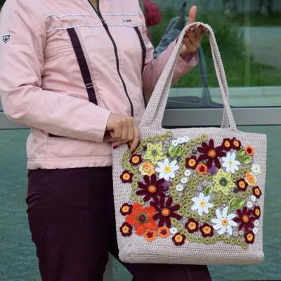 Вязаная основа из Троицкого хлопка Жасмин нежного цвета; пришитая аппликация в технике ирландское кружево. Укреплена дублерином, вставлено донышко. Вшита подкладка с карманами для ключей, телефона, кошелька. Застёжка на магнитную кнопку.