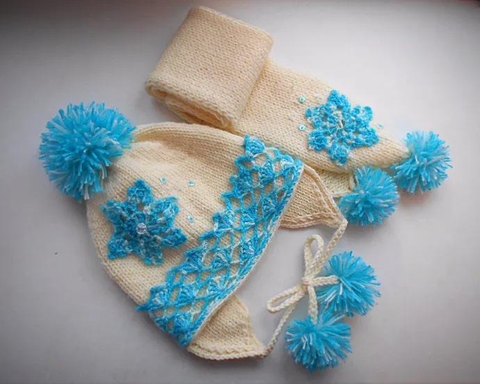 Детский комплект "Снежинка",связан в подарок племяннице!!!) Шапочка очень тёплая,верх - вязаный,а внутри вшит трикотажный хлопковый плотный подклад!Шапочка и шарфик выполнены в комбинированной технике,в работе были использованы и спицы и крючок) Главным украшением комплекта являются связанные крючком снежинки,ну и конечно симпатичные помпончики!также работа украшена бусинами,пайетками и бисером) Пряжа - LANA GOLD от ALIZE,а для декора - ANGORA GOLD.