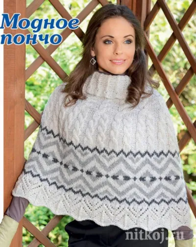 Пончо выполняется из шерстяной пряжи белого, серого и черного цветов.