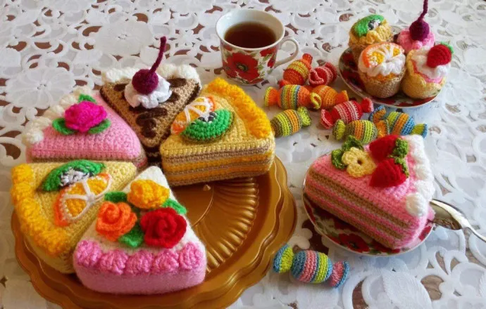 Интересно, конечно. Но это ж надо так кропотливо вывязывать слои торта, конфетки и прочую мелочь. Огромное желание для этой работы надо. А вообще, здорово! Наверное, идеальное применение остатков пряжи.
