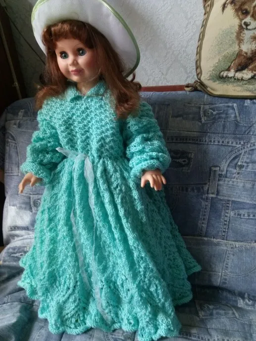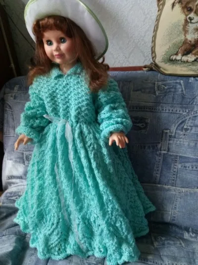Работа не моя,вязала дочка,Александра.Куклу купила я сегодня..раньше и мечтать о такой не могла.Решила на ней показать платьице.Дочь вязала для крестницы.