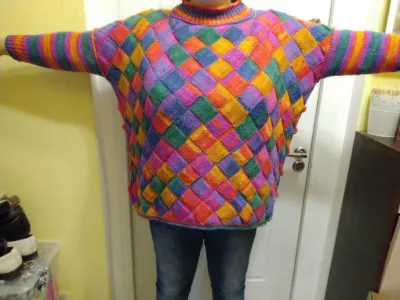 Очень красиво, ярко и не портит фигуру, замечательная работа! Только, пожалуйста, пишите название техники правильно. Происходит оно от английского entrelac, соответственно, по-русски это правильно называть энтрелак. Но едва ли не чаще в русскоязычном интернете употребляется слово энтерлак.