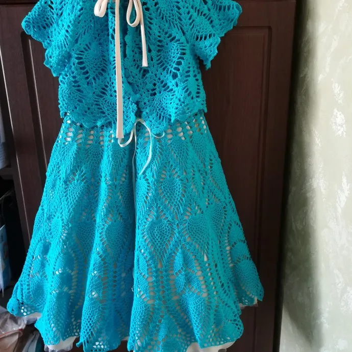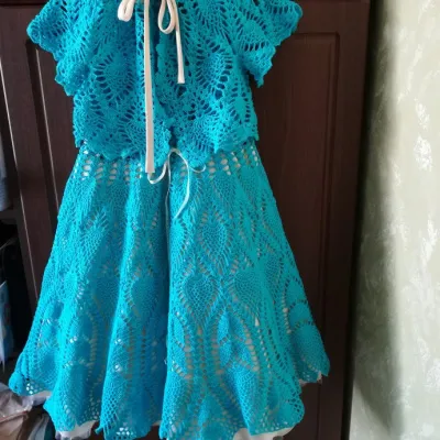 посмотрела, что - то этим летом у меня сплошные голубые оттенки получаются. Вот и кофточка маме тоже в голубом цвете, и платье для крестницы. Вязала по мастер классу Светланы Берсановой из интернета. Сама пока что еще не научилась