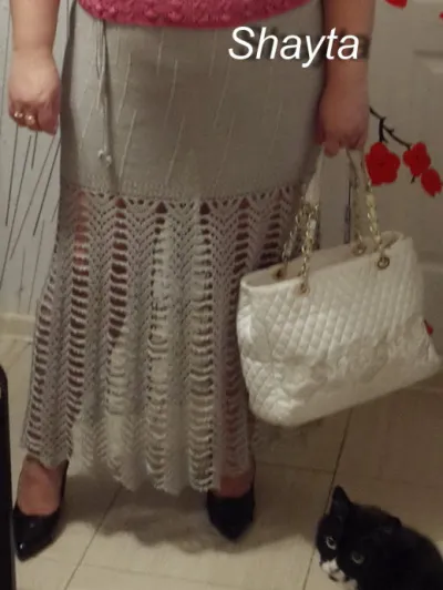 Но к моделям такого дизайна отношусь настороженно. И вот, почему. Плотная часть на юбке зрительно увеличивает ту часть, что под ней спрятана. Я вязала платье на заказ подобного дизайна, поразмыслив, мы с заказчицей отказались от него. И ещё. Как бы не хотелось в жару пощеголять в такой «сквознячковой» юбке, да ещё связанной крючком, да ещё из такой великолепной хлопковой ниточки, лучше надеть под нее нижнюю юбку, причем, такой же длины, как сама эта восхитительная юбочка. А так… Не очень эстетично просвечивают толстоватые ножки, что, конечно, нежелательно… И к такой модели лично мне затруднительно подобрать верх: мне кажется, что подойдёт только недлинная кофточка без узоров из такой же нити: это соберёт фигуру в одно целое, подчеркнёт красивую ажурную часть юбки. А такая длина юбки, конечно же, требует каблучка. Если не носить ее на пляже. Но кто, ж, наденет эту красоту на пляж???