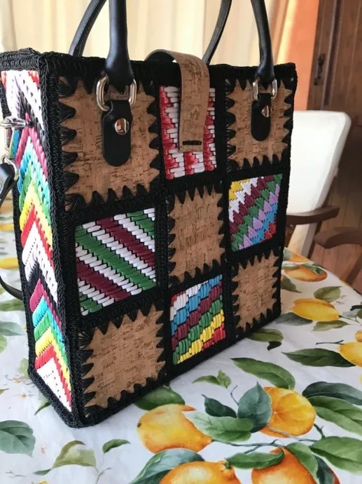 Связала на заказ необычную сумку-пазл. Материалы: пластиковая канва, огородная сетка, рафия, пробка, кожаные ручки, шнур.