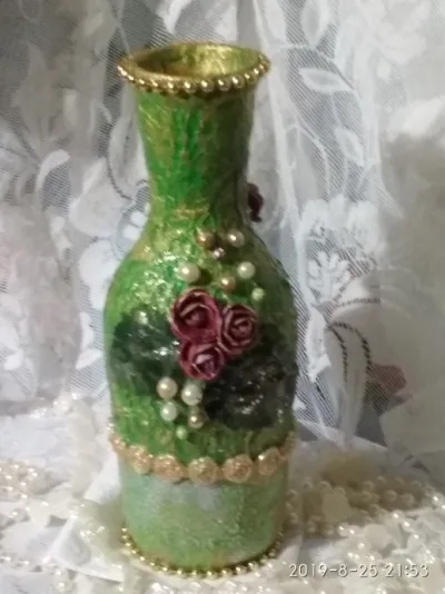 Бутылка декорирована листьями,цветами,бусинами.Основа- простые салфетки,имитирующие кракле.Дома- только вязание!!!