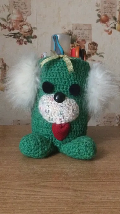Это моя первая работа (я новичок). Постаралась связать для сына вот такую собачку-карандашницу, надеюсь Вам понравиться.