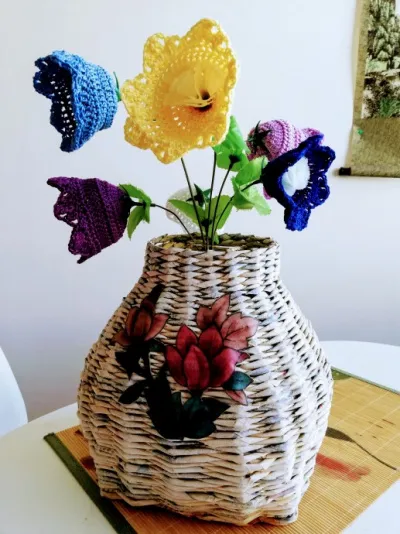 Колокольчики связаны из хлопковой нити, а вазу я сплела из газет и украсила в технике декупаж.
