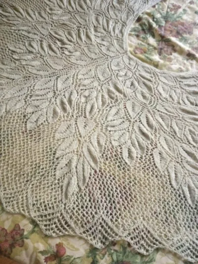 Сегодня довязала шаль "Весенняя роща".Доработка впереди,пока разложила только.