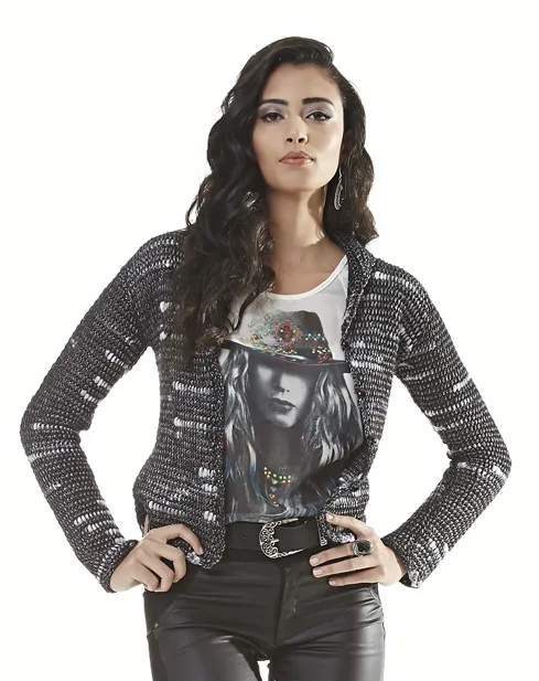 Насколько поняла машинный перевод, жакет вяжется тунисским крючком №4, про пряжу информации не нашла, это видимо какая-то фасонная или фантазийная чёрно-белая.