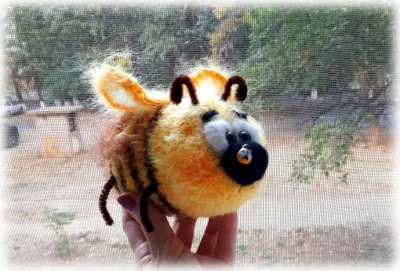 Носик и белки глаз валяные. Крылышки связаны из тонкого мохера, по краям обвязаны крючком. Наверху пуговка, она скрепляет крылышки. Ножки и усики из синельной проволоки (продаются в Леонардо).