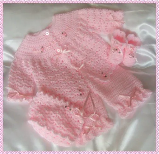 Спрятать концы. Пришить пуговицы. Продеть ленту через кажд. 2 ст. с 2 н. вокруг кокетки и внизу рукавов. Украсить розочками и бантиками.
