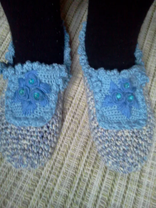 Удобные, теплые, нарядные тапочки.Связаны крючком, вязка плотная,пряжа акрил.Вышивка розочки.