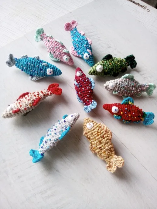 Брошь выполнена из хлопковой пряжи, украшена бисером. Такой интересный аксессуар придаст Вашему образу изюминку. Размер "рыбок" 4-6 см. Выполню в любимом Вами цвете.