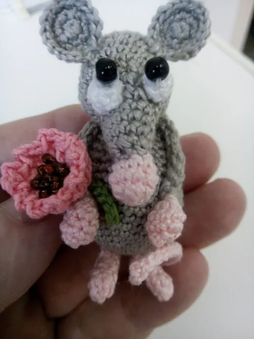 Брошь связана на заказ для прекрасной девушки Елены. Поэтому у меня как-то придумался образ влюблённого мальчика с цветком. Размер броши 6 см. Связан из ниточки ирис крючком 1, 0 мм.Цветочек в серединке вышит бисером. Хвостик свободно закручивается, не стала его фиксировать. Ножки связала в виде овальчика, пришила за пяточки. пробовала сделать ножки , как ручки, смотрится как-то несерьёзно. Заказчице очень понравился Крысик, его уже забрала.