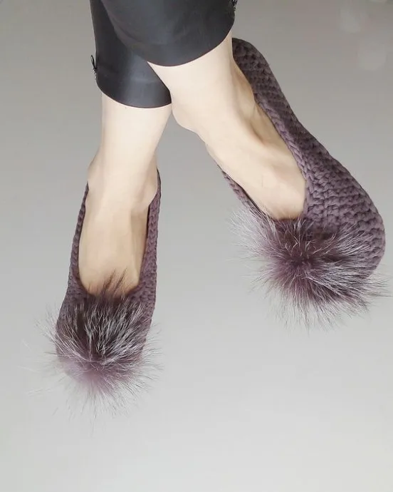 Безумно красивые тапочки из толстой трикотажной пряжи. Вяжутся быстро, а мех стал очень праздничным украшением.