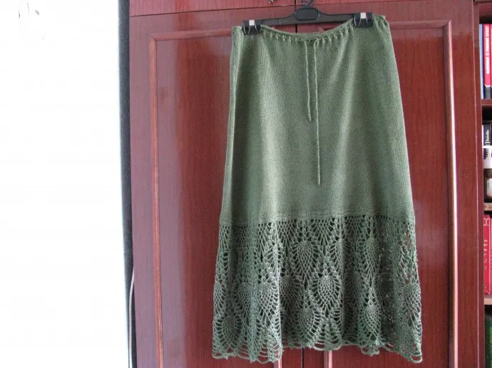 Низ юбки обвязала расширяющим узором из ананасов, нашла в интернете.