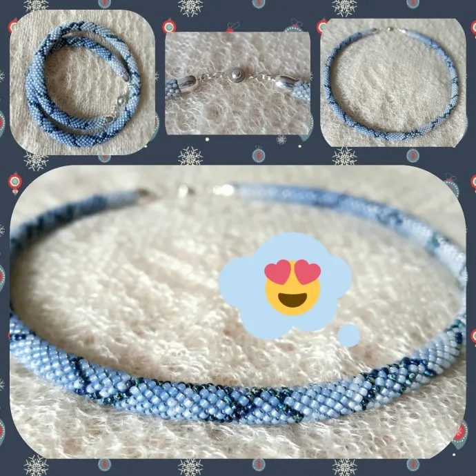 Ожерелье из японского бисера, связала для подруги в подарок. Использовала бисеры Miyuki #4518, 2 мм, TOHO #2102 (голубой), 2 мм; фурнитура от BeadSmith (амер.) для японского вязания бисером Kumihimo: наконечник 4мм, цвет: серебро, и пряжка-зажим; джинсовая нить серого цвета, крючок.