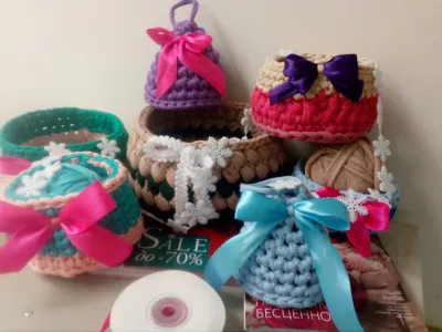 Работаю в офисе. Подготовила для своих клиентов небольшие подарки в виде маленьких корзиночек и колокольчиков. Придут поздравить с наступающим с подарками, сувенирами..... ну не могу принимать без участия! Вот и решила подготовиться.....