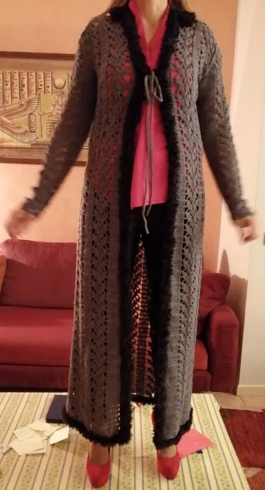 Хорошая работа. Фишка длинных изделий в том, что под тяжестью полотна длина удлиняется, и заранее угадать окончательную длину бывает сложно, все зависит от того, как поведет себя пряжа. Я вязала длинный жакет из толстый пряжи, который в последствии из-за удлинения под тяжестью пряжи превратился в пальто))