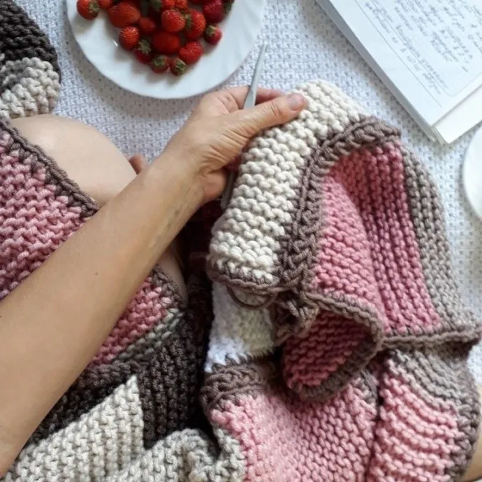 Вещь уютная, но по фото не понятно — это обычное полосатое полотно платочной вязкой? Тогда зачем там отгиб?