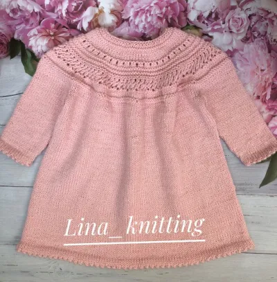 Далее вязать без прибавлений, через 36 (40) 46 см от начального ряда (или за 2 см до нужной длины платья, измеряя по переду) перейти на круговые спицы № 5, связать 6 круг.р. платочной вязкой и закрыть все петли.