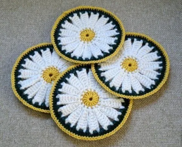 Вот и все! Размеры подставок зависят, конечно же, от толщины пряжи и крючка. В моем случае, ромашки вязались крючком №5 и получились 15 см в диаметре.