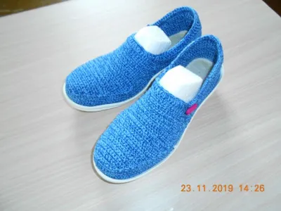 Мокасины связаны из пряжи Нарцисс - 100% хлопок. в 100 г 395 м. Вязала крючком № 2,0 в 2 нити. меланж из 2 нитей - голубые и синие. Подошва LINDA.