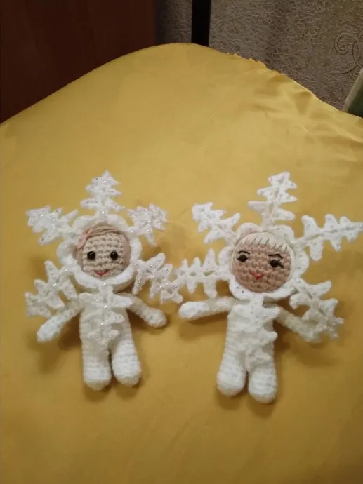 Зима на пороге, а снегом и не пахнет. Вот и связались такие девочки-снежинки, высота от ножек до головки 13 см, с лучиком - 18 см