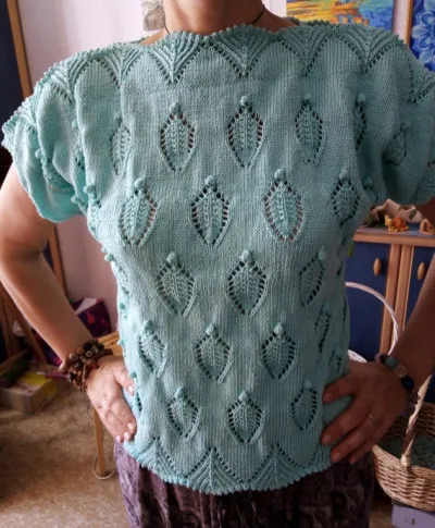 1. Шишечки. Я бы их не вязала. На мой вкус они, как бы поточнее выразиться, немного надуманны, лишневатые… Для меня они — перегруз, лишают кофточку некоторой элегантности. Или сделала бы эти шишечки менее активными, малюсенькими, еле заметными. Хотя, не исключаю, что «в жизни» смотрятся нормально. Так бывает. Дело вкуса.