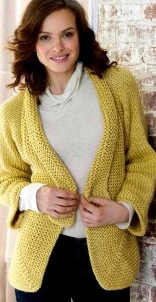 Красивый жакет приятного желтого оттенка цвета спицами