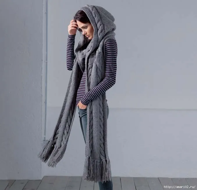 По-моему вещичка нужная в гардеробе. Уделите несколько вечеров и она будет превосходно смотреться на Вас. Скоро зима, так что такой шарф-капюшон сможет защитить Вашу голову и шею от холода.