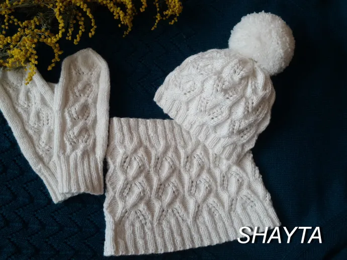 Здравствуйте, модницы! Этот комплект связан из пряжи “Наташа” 50% шерсти, 50% акрила, в 100гр-250м, круговые спицы №3, чулочные №2, р-р 54-56. Ушло 3 мотка.