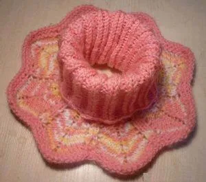 Материалы: 80 грамм пряжи кораллового цвета, 40 грамм меланжевой пряжи в тон, 250 м/100 грамм.